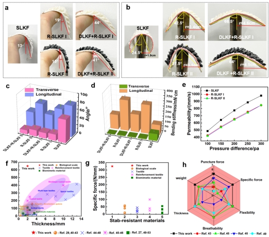 图4 R-SLKF的柔韧性、透气性和综合特性比较(a)SLKF和R-SLKF在手掌上的弯曲角度;(b)SLKF和R-SLKF在圆形工具上的悬垂角度;(c)SLKF和R-SLKF的垂度角;(d)SLKF和R-SLKF的弯曲刚度;(e)SLKF和R-SLKF的透气性;(f) 这项工作与先前报道的防刺材料之间的比较;(g)防刺材料的比峰值载荷;(h)与先前报道的防刺材料的综合性能比较