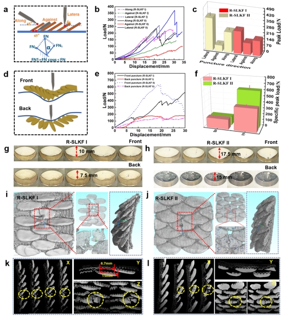 图3 R-SLKF斜向穿刺、正反面穿刺及CT扫描结果(a) 斜向穿刺及刀尖处的应力分布;(b)R-SLKF斜向穿刺防刺性能及(c)在三个穿刺方向上的峰值载荷;(d) R-SLKF正面和背面穿刺时的受力情况;(e)R-SLKF正反面的穿刺情况及(f)峰值载荷;(g)R-SLKF I和(h)R-SLKF II正反面的穿刺过程;(i-k)R-SLKF I和(j-l)R-SLKF II在三个切片方向上的CT扫描结果