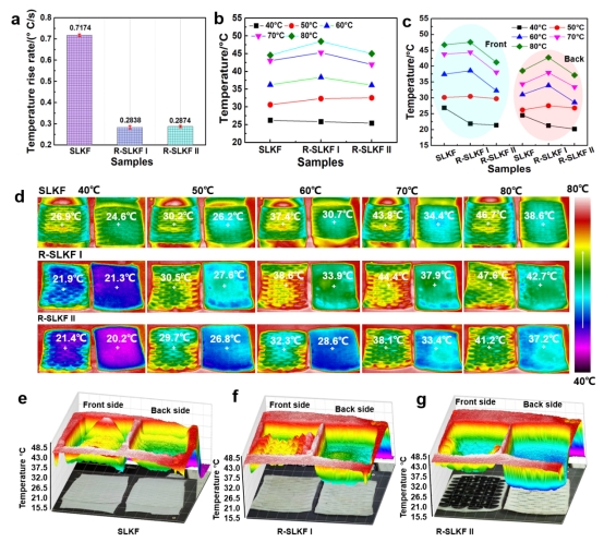 图5 SLKF和R-SLKF的热学性能(a)SLKF和R-SLKF的温升速率;(b)SLKF和R-SLKF表面的平均温度,及(c)在不同加热温度下正面和背面的温度;(d) SLKF和R-SLKF在不同加热温度下的红外图片;(e-g)SLKF和R-SLKF在60℃下的三维红外图片