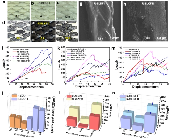 图2 R-SLKF在不同基体静置时间、穿刺位置和方向下的防刺性能(a-f)基体在不同静置时间下制备的R-SLKF外观形态;(g)R-SLKF I和(h)R-SLKF II的截面SEM图像;(i-j)基体在不同静置时间下制备R-SLKF的防刺性能及比峰值载荷;(k-l) R-SLKF在三个不同穿刺位置的防刺性能及峰值载荷;(m-n)R-SLKF在三个不同穿刺位置的防刺性能及峰值载荷