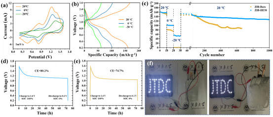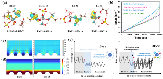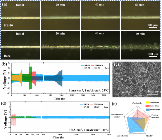作为新一代锂离子电池的替代品,水系锌离子电池因其固有的不可燃、无毒和低成本的特性而受到未来储能应用的巨大兴趣。然而,它们的实际利用受到电解质在零度以下条件下冻结的阻碍。在这项研究中,贾浩研究员提出了一种新型高熵(HE)电解质,该电解质与混合溶剂一起,以减轻电解质在低温下的冻结,抑制日历腐蚀,并增强锌离子转移动力学。具体来说,等体积结合乙酸乙酯、乙二醇和二甲基亚砜作为溶剂组分不仅可以诱导氢键重构,而且改变HE电解质环境中Zn离子的溶剂化鞘。这种混合助溶剂的协同耦合有效地利用了单个溶剂添加剂的特性,并特别在低温条件下促进了循环反应的可逆性。得益于抗冻和溶剂化结构调控特性,配备HE电解液的锌对称电池可以在不同温度下在低锌盐浓度(1 m)下工作2500 h以上。
