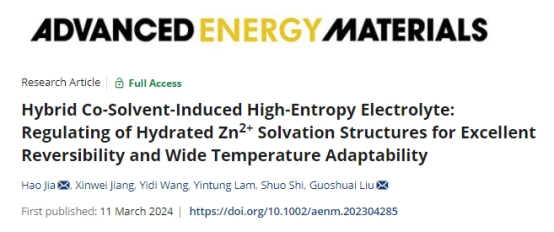 绿色纺织化学品团队贾浩研究员和环境与生态学院刘国帅副研究员合作在能源领域国际顶级期刊《Advanced Energy Materials》发表题为“Hybrid Co‐Solvent‐Induced High‐Entropy Electrolyte: Regulating of Hydrated Zn2+ Solvation Structures for Excellent Reversibility and Wide Temperature Adaptability”的研究论文。