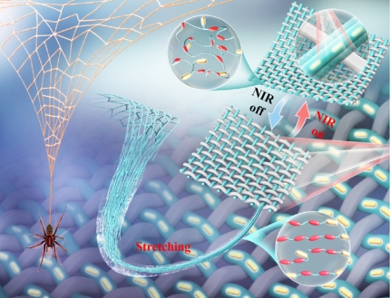 图1:受仿生蜘蛛网启发,设计具有分级结构的光响应金纳米棒复合液晶弹性体智能纱线及织物示意图