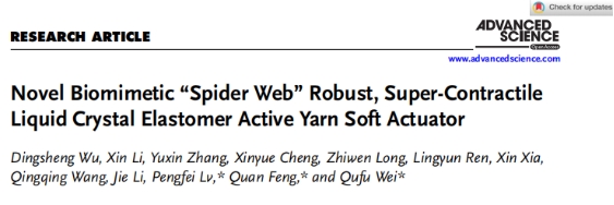 魏取福教授团队和安徽工程大学凤权教授团队联合新疆大学夏鑫教授团队利用静电纺丝和光交联策略,快速稳定的制备了具有跨尺度分级结构的金纳米棒复合LCE(AuNRs@LCE)智能纱线软体驱动器,该纱线致动器呈现出超收缩变形特性,作为概念验证,将其应用于人工肌肉、微型游泳器和智能止血绷带等方面。相关工作以“Novel Biomimetic “Spider Web” Robust, Super-Contractile Liquid Crystal Elastomer Active Yarn Soft Actuator”为题,发表于Advanced Science(DOI:10.1002/advs.202400557)期刊上,文章第一作者为色情导航