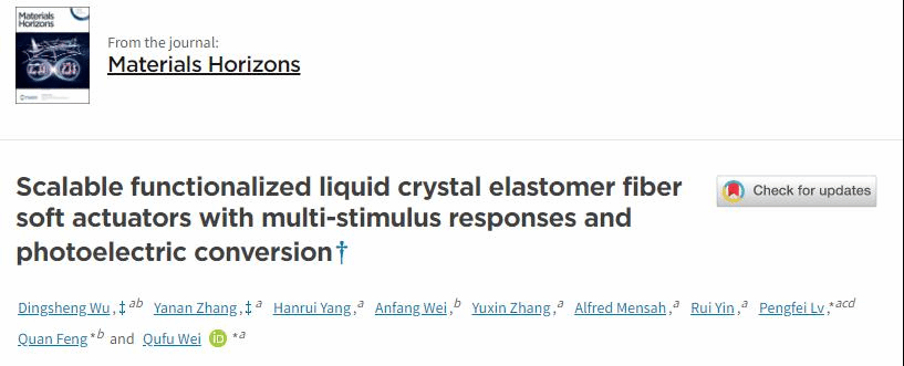 魏取福教授、吕鹏飞研究员和安徽工程大学凤权教授团队合作提出了通过一种简单的干法纺丝和涂层策略,规模化生产具有光、电、热多刺激响应和快速大致动变形的纤维软体驱动器。该纤维软体驱动器不仅结合了LCE的可逆形状变形特性和PDA@MXene的优异的长效光电特性,而且还实现了光、电、热多刺激响应快速驱动。为了验证纤维软体驱动器的光电领域应用前景,研究人员开发了光驱动的人工肌肉、微型光热智能电路开关和光驱动自适应智能窗系统。这项工作提出的策略为先进的多功能软体驱动器开辟了一个新的技术领域。相关工作以题为“Scalable Functionalized Liquid Crystal Elastomer Fiber Soft Actuators with Multi-Stimulus Responses and Photoelectric Conversion”的论文发表在国际权威期刊《Materials Horizons》上。该研究工作得到了国家自然科学基金、江苏省自然科学基金和色情导航