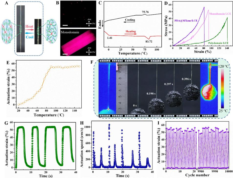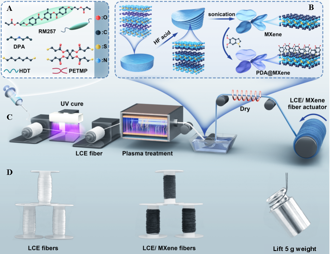 研究者首先选用具备优异光热特性和导电特性的MXene纳米片作为光热转换分子,通过具有优异光热性能和良好粘附特性的PDA改性设计制备具有长效光电特性和粘附性能的PDA@MXene墨水,随后通过干纺技术和两步交联策略连续化生产具备可逆驱动形变的LCE长纤维软体驱动器,最后采用等离子体处理和涂层技术制备PDA@MXene/LCE复合纤维软体驱动器,如图所示。研究表明,PDA改性处理不仅能有效抑制MXene表面氧气渗透,而且有助于实现PDA/MXene功能层与LCE纤维的稳定界面结合,从而赋予纤维软驱动器高效光热性能和长效电热特性。在外界光/热/电等多重刺激下,PDA@MXene/LCE纤维软体驱动器可以在0.4秒内产生超过50%以上的驱动变形。