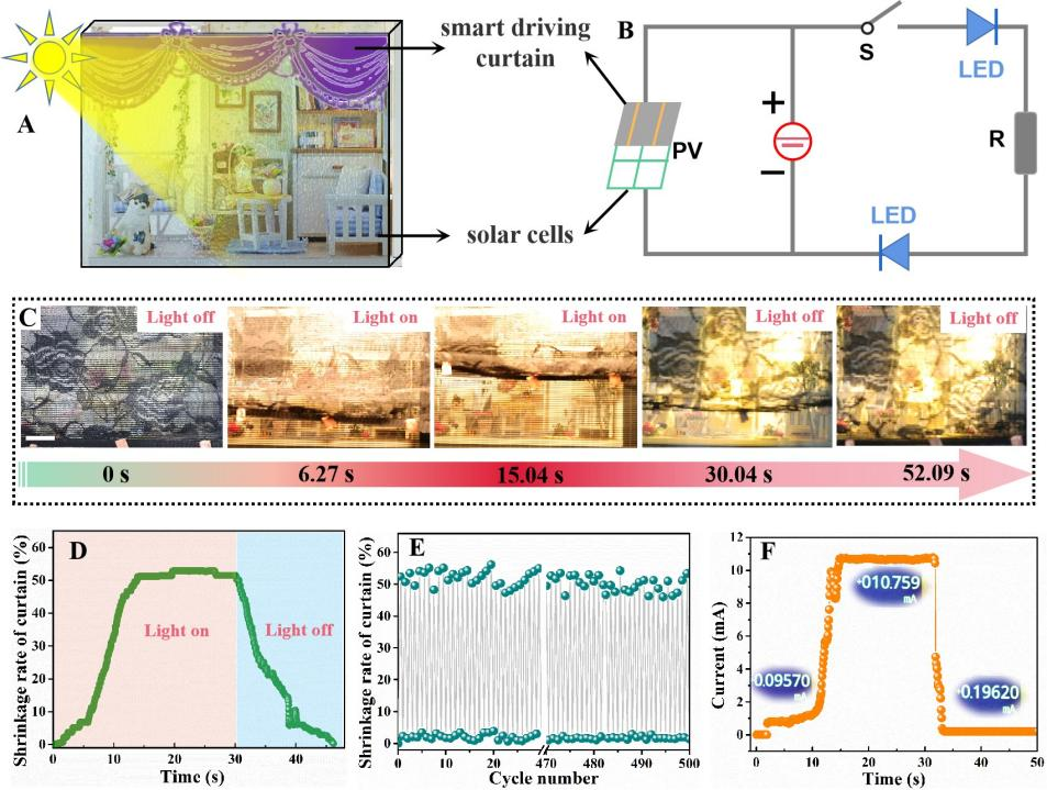 由于复合纤维软体驱动器具备良好的柔韧性,而且具备长效光电驱动特性,研究者以纤维驱动器为基础编织了一种光驱动窗帘,并将其与透明的碲化镉太阳能电池集成,构建新型自适应智能窗系统。研究者发现智能驱动窗帘能够在光和热刺激下实现自发可逆驱动,从而达到智能调节的目的。同时,在窗帘的智能驱动过程中,太阳能电池可以有效吸收光能并将其转化为电能为房屋供电。整个能量窗集成系统完全自发、智能调节,实现了智能驱动与能量采集的有机耦合(如图所示)。作为一种将智能驱动与自发能量收集相结合的概念系统,它将为未来的智能建筑和能量采集提供一种新的设计方式。