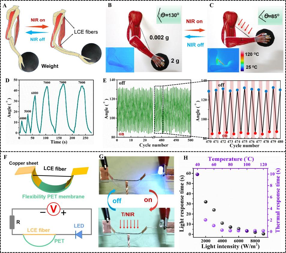 研究者发现LCE纤维在光、热、电等刺激时均表现出快速稳定的可逆驱动形变,而且纤维软体驱动器具备良好的力学性能,其断裂强度达到52.33±1.95MPa,可以满足日常纺织品编织要求。其响应速度最快达到0.4s,致动变形率最高可以达到60%,在热驱动条件下,所制备的LCE纤维可以轻松地举起比LCE纤维多1000倍的重量,纤维驱动速度和加速度最高可达1071 cm/s和13125 cm/s2。此外,经过多次重复使用,制备的LCE纤维仍保持稳定的驱动速率,表明具有优异的重复使用性能,如图所示。