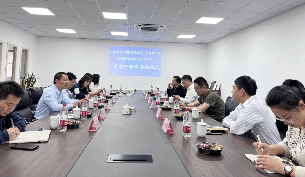 针织中心与无锡爱柯毛绒有限公司举行了校企合作签约仪式。