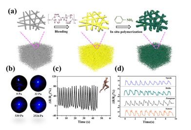图1. (a) PANI/BC/CH气凝胶制备流程图; (b)不同压力响应下LED灯响应图;(c)用于计步传感的电阻响应图;(d)对四种声音信号的电阻响应图。