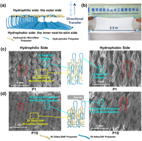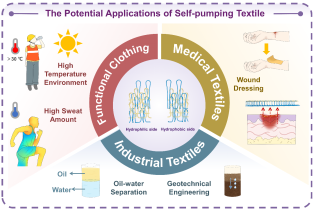 暴露在高温环境中的个人越来越容易患与热有关的疾病,因此,具有汗液管理能力的功能性服装越来越受到重视。为个人汗液管理而设计的织物能够有效且及时地将汗液从皮肤上运走,从而增强热舒适性同时节约能源。然而,这些功能性服装的制造过程需要复杂的物理和化学改性,导致耐久性差且对大规模生产的适用性有限。本文受皮肤毛孔单向排汗的启发,提出了一种“类皮肤”自泵送织物(SPBF),由配置在双层针织物上的疏水聚酯线圈和亲水性超细纤维聚酯线圈组成。这种构造允许从皮肤单向芯吸汗液。当氨纶长丝引入涤纶织物时,累积单向传输指数增加到717.18%,大于原始涤纶织物的累积单向传输指数(393.71%)。这种特殊的性能是通过在微纤维聚酯和普通疏水聚酯的主要组合中产生不同的毛细管效应来实现的。除了功能性服装外,这种“类皮肤”自泵送织物在各种应用中具有巨大潜力,包括工业用纺织品、医用伤口敷料、岩土工程和设备隔膜。