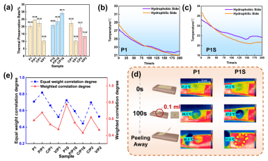 图5(a)样品的保温率。(b-c)P1和P1S的疏水侧和亲水侧之间的温差。(d)红外热像仪的摄影流程图和织物P1、P1S的红外热像照片。(e)综合评价后的等权重关联度和加权关联度。