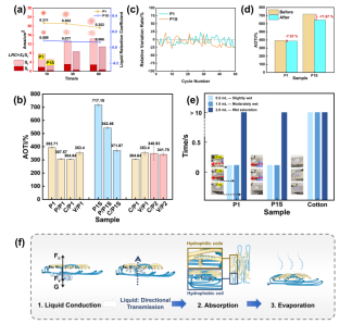 图3 (a)织物P1和P1S上铺展10 s、30 s和60 s后液体的面积和阴影深度。(b)样品的累积单向传输指数。(c)在50个循环中相对于初始AOTI值的变化率。(d) P1和P1S在家庭洗衣测试150分钟前后的AOTI。(e)润湿织物附着力测试。(f)沿SPBF垂直方向的单向液体传输示意图,包括传导、吸收和蒸发。