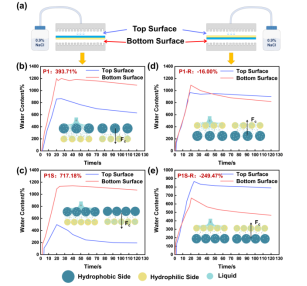 图4 (a)实验装置示意图。(b-c)两侧含水量的曲线,以及织物P1和P1S的导水过程。(d-e)两侧含水量的曲线,以及织物P1(反向)和P1S(反向)的导水过程。