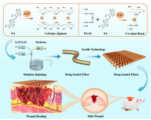 在人体皮肤创面修复过程中,多功能特性的敷料是创面愈合的关键。作为一种新型的创伤治疗材料,水凝胶具有独特的物理和化学特性以及生物相容性,可以给创面创造最佳的愈合环境,其不仅可以满足不同的敷料要求,还可以作为有效的药物载体。皮肤的自我修复分为四个阶段—凝血阶段、炎症阶段、增殖阶段、重塑阶段。因此,理想的创伤敷料应该具有有效药物装载和控制释放的功能,而且还应该具有增强细胞增殖和迁移的能力,以加速伤口愈合过程。尽管载药水凝胶在伤口治疗应用中表现出巨大的潜力,但目前研究仍存在药物释放过快,力学性能差,敷料不透气等问题。为解决以上问题,我们报道了一种强韧的SA/PAAS水凝胶纤维敷料,其具有定向控制药物释放的功能,可促进伤口愈合。模仿竹子的空腔结构,将药物溶液封装在纤维内,药物释放的速度可以通过控制纤维壁厚来调节。水凝胶纤维通过氢键和钙离子交联形成交叉网络结构,使得拉伸强度提高38%。通过在编织过程中精确控制送纱过程,可以将载药纤维固定在特定位置,靶向递送到皮肤伤口部位。载药水凝胶织物具有促进伤口愈合效果,同时满足敷料所需的透气性和生物相容性。研究结果显示了SA/PAAS载药水凝胶织物在皮肤创伤治疗方面的潜力。