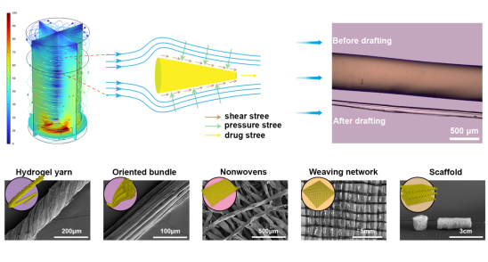 水凝胶纤维同时具有水凝胶的性能特点与纤维的结构优势,其独特的生物学/工程学制造优势受到研究者的广泛关注。兼容传统编织、纺织、堆叠等加工策略的水凝胶纤维可以有效构建一维、二维、三维产品,在生物医用领域具有极大的应用前景。目前,水凝胶纤维的制备方法主要包括模板法、预凝胶牵伸法、静电纺丝/溶液喷射纺丝、微流控纺丝法与湿法纺丝法等。然而,水凝胶的三维网络结构特性及其较弱的力学性能限制了其牵伸加工,因而无法通过机械牵伸的方法制备小直径的水凝胶纤维,这极大限制了水凝胶纤维的应用研究。因此,亟需开发一种高效可控、适应范围广的方法用于规模化制备直径可控、力学性能优异的水凝胶纤维。