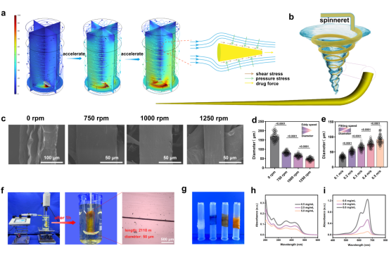 在自然界中,水涡能够轻易地移动物体沿着特定方向旋转,这与物体和水流之间的曳力有关。因此,通过调节流体涡旋与纤维之间的速度差,可以轻易改变两者之间的曳力,从而有效调控水凝胶纤维直径(图1a-e)。HDSP能够连续制备直径均匀的水凝胶,搭载多通道喷丝装置的HDSP为水凝胶纤维的工业化生产提供了可行的解决方案(图1f)。基于水凝胶纤维的成型机理与微观结构,疏水药物与亲水性药物均能有效负载到水凝胶纤维中(图1g-i)。