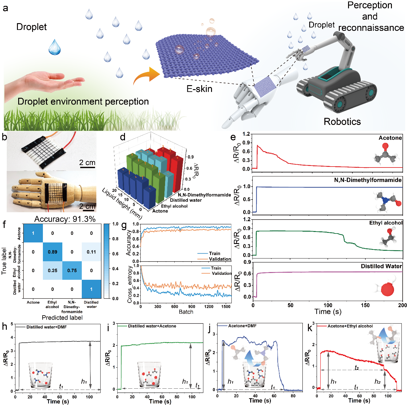 基于上述PKMPBC纤维的综合性能,作者进一步将其织造成纺织基摩擦纳米发电机(PKT-TENG),获得272.54 V的最高开路电压、14.56 μA的短路电流和86.29 mW m-2的最高功率密度,可构建智能服装实现人体运动的实时监测和商用电子器件的稳定驱动。更进一步,依托纤维的疏水表面与压阻响应,构建了液体识别阵列与机器学习模型,实现了对蒸馏水、乙醇、丙酮与DMF等液体运动特征的稳定感知与识别,分类准确率可达91.03%,为面向智能制造与无人化场景的液体感知和预警电子纺织品提供了新方案。