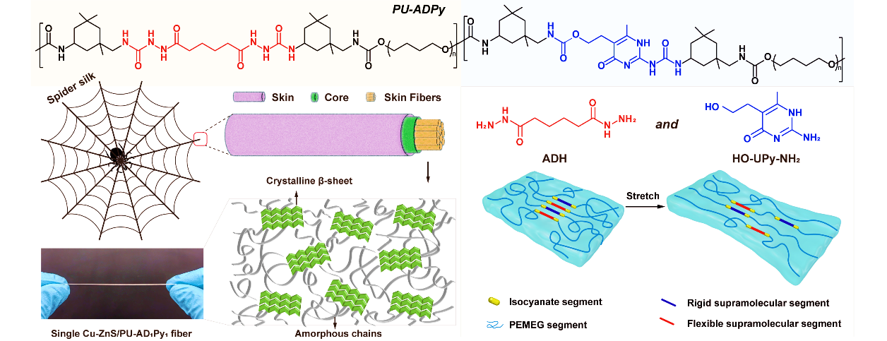 王潮霞教授联合荷兰格罗宁根大学Katja Loos教授,采用错位互配效应平衡聚氨酯-脲网络内超分子结合强度和能量耗散性能,通过引入柔性和刚性芳杂环超分子片段扩链剂成功制备了一种仿蛛丝结构氢键阵列型高机械强度、高延展性室温自修复聚氨酯-脲长余辉发光纤维。