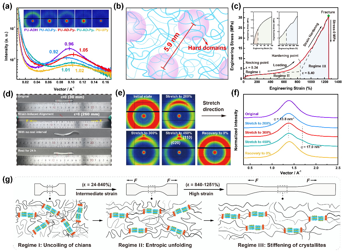 得益于不匹配超分子片段相互作用,聚氨酯-脲网络可以有效消除超分子片段过度结合,形成尺寸均一的高密度氢键网络,在不牺牲强度和弹性的情况下提高聚合物网络的能量耗散。所制备的聚氨酯-脲薄膜在拉伸加载过程中表现出明显的应变诱导取向,卸载后取向结构回复。这种动态解离和重新结合的过程保证了聚氨酯-脲网络具有优异的力学性能。