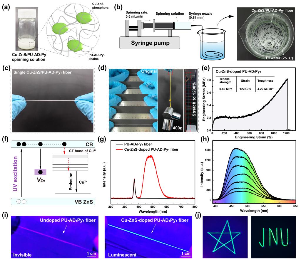 通过湿法纺丝工艺制备的聚氨酯-脲发光纤维直径均匀,表面光滑,具有良好的力学性能,聚氨酯-脲发光纤维可用于制备各种图案,“五角星”和“JUN”图案在黑暗条件下可以清晰地被观察到,且在激发光源停止后存在青色余辉现象。