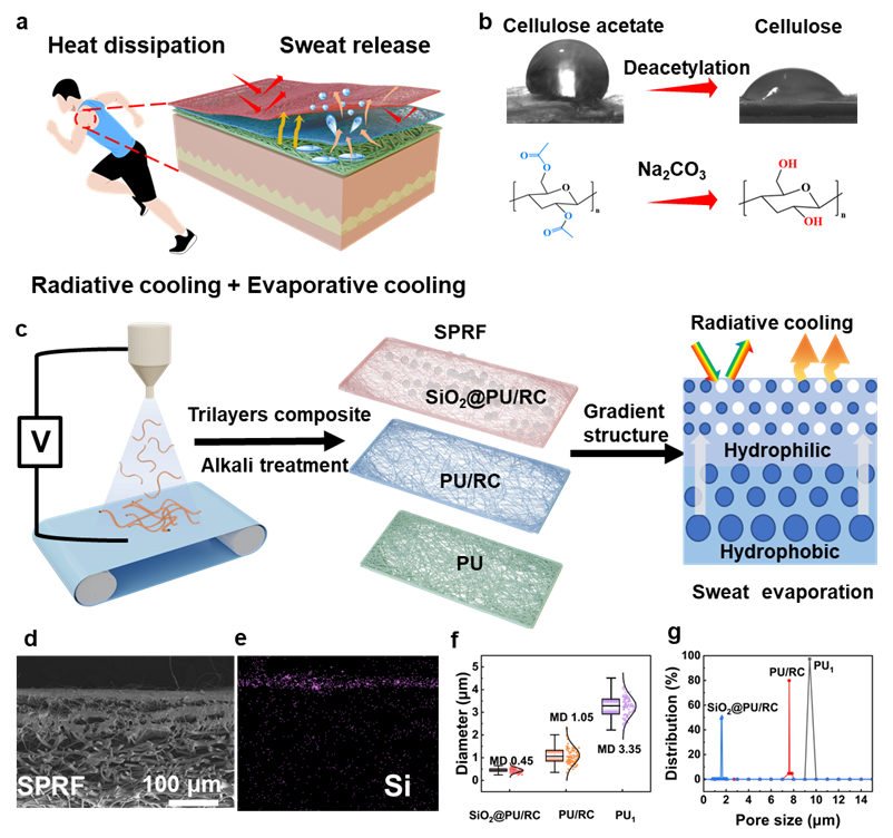魏取福教授/吕鹏飞研究员团队联合加泰罗尼亚理工大学化学工程系Kasper Moth-Poulsen教授在国际顶级期刊《Advanced Fiber Materials》发表题为“Integrated Passive Radiative and Evaporative Cooling in Hierarchical Gradient Fibrous Fabric with Wide Spectral Response for Advanced Thermal-Wet Management”《具有宽光谱响应的分级梯度纤维织物中集成被动辐射与蒸发冷却技术,用于先进热湿管理》 的研究成果。研究提出了一种分级梯度结构织物,以应对热管理和水分传递两方面的挑战。该分级梯度结构可在整个太阳光谱范围内实现宽带散射,从而增强辐射冷却性能,同时促进定向水分传输以提供额外的蒸发冷却。SPRF材料反射率达94.2%,发射率达96.7%,实现了低于环境温度4.4℃的辐射冷却效果。