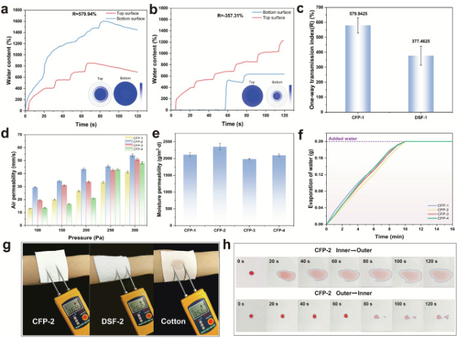 传输过程主要是纤维层间的孔隙梯度之间的相互作用,可以产生毛细驱动力(FW)和差动毛细效应的附加压差(∆P),可具体拆分为五个阶段:接触、抽吸、传输、扩散、蒸发。具体机制如图3.e所示。