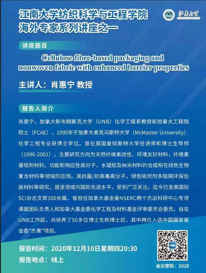 海外专家系列讲座”、“江南纺织国际论坛”等各种中外在线学术交流,到目前为止,已有近20位来自英、美、加、日和中国香港的海外专家开展了多场在线讲座,受到全院师生的一致欢迎。