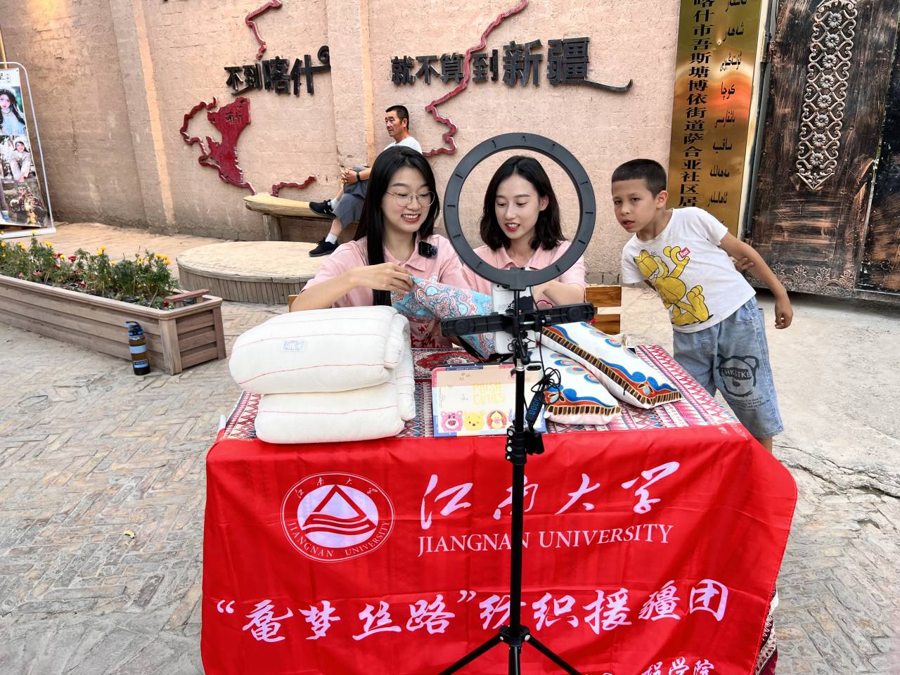 “鼋梦丝路”纺织援疆团,今天是我们首场纺织惠农公益直播,现在向您推荐的是来自新疆的长绒棉被!”近日,一个由7名师生组成的直播团队从无锡乘坐40多个小时的火车来到4000公里外的新疆,为新疆的纺织产品代言。没有熟练的技巧,没有精湛的话术,他们用自己的一腔热忱为新疆带货,探索纺织产业助力乡村振兴的新路径。