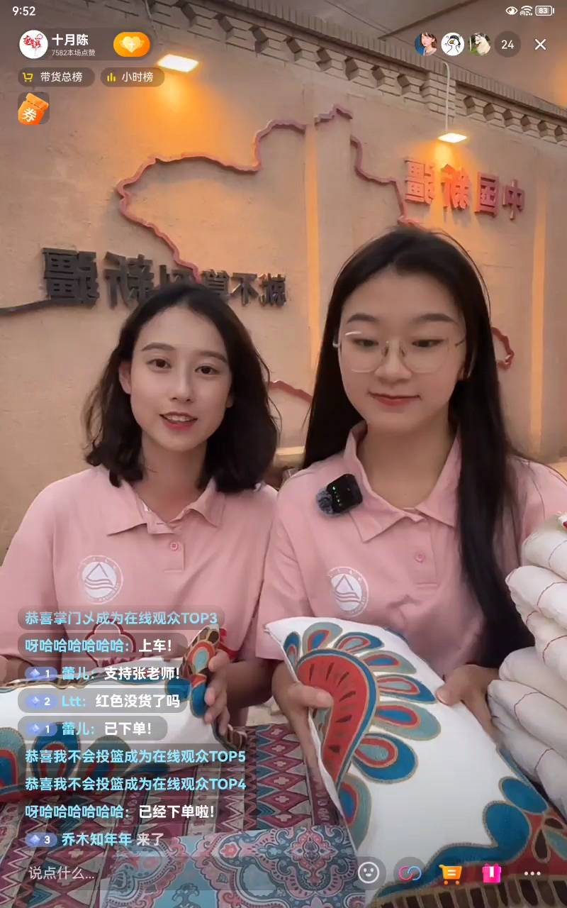 广阔乡村,大有可为。援疆团成员深入田间地头和村庄一线走访调研当地纺织产业发展情况,与当地群众和村干部交流过程中发现大家只懂棉花种植和手工纺织品制作,产品销售渠道单一仅靠企业上门回收。如何帮助大家打通生产和销售之间的壁垒,让农民的腰包更加“鼓起来”?援疆团成员陈弈菲结合自己学习积累的新媒体运营经验,萌发了“纺织+直播带货”的想法。直播时,柔软舒适的新疆长绒棉被、具有民族风情的隔热鼠标垫、深受年轻人喜爱的帆布包等一件件具有当地特色的纺织品依次亮相,主播们从生产原料、织造工艺、印染技艺、文化内涵等方面向观众推介不同款式的新疆特色纺织品,还现场穿搭、演示,与直播间的粉丝、观众交流互动,向他们科普纺织基础知识、讲述新疆纺织产业背后的红色故事,现场氛围感十足。援疆团成员郑晴表示:通过此次“直播带货”不仅让我近距离的感受了新疆的特产文化并且有幸亲身参与了新疆的经济文化建设,我感觉十分自豪。