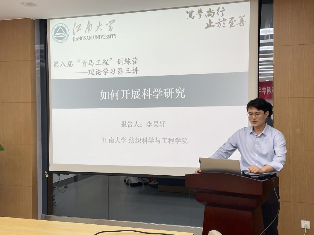 李昊轩老师就“如何开展科学研究”一题切入与同学们进行分享。从自身经历出发,分“如何寻找科研方向”、“如何打破科研瓶颈”、“科学研究有无终点”三方面介绍科学研究的广义范畴。李老师在讲课中强调,回望百年,青春向党!习近平总书记在庆祝中国共产主义青年团成立100周年大会上号召广大青年:“要做刻苦学习、锐意创新的模范,带头立足岗位、苦练本领、创先争优,努力成为行业骨干、青年先锋”。作为一名高校青年科技工作者,他见证了国家的强大,也清醒地看到很多关键技术还存在差距。李老师表示,同学们作为新时代的纺织学子,要谨记习近平总书记的殷切希望,要做理想远大、信念坚定的模范;要做刻苦学习、锐意创新的模范;要做敢于斗争、善于斗争的模范;要做艰苦奋斗、无私奉献的模范;要做崇德向善、严守纪律的模范,以实际行动践行一名共青团员曾对组织许下的誓言。