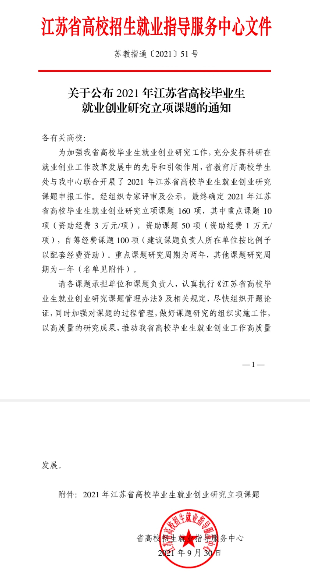 色情导航 获批2021年江苏省高校毕业生就业创业研究课题立项