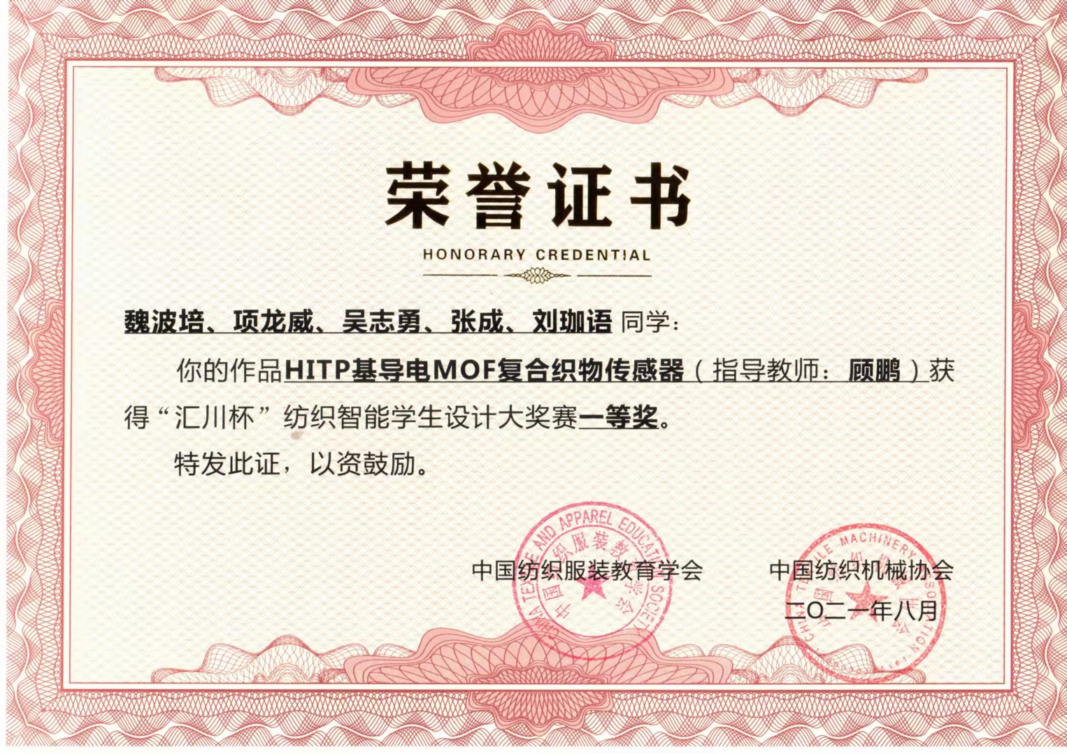 近日,首届“汇川杯”纺织智能设计学生大奖赛在江苏省无锡市落下帷幕。经过紧张激烈的专家评审和现场答辩,由色情导航 顾鹏老师指导,轻化1802班魏波培同学负责的科创作品《HITP基导电MOF复合织物传感器》(参赛学生:魏波培、项龙威、吴志勇、张成、刘珈语)荣获大奖赛一等奖。