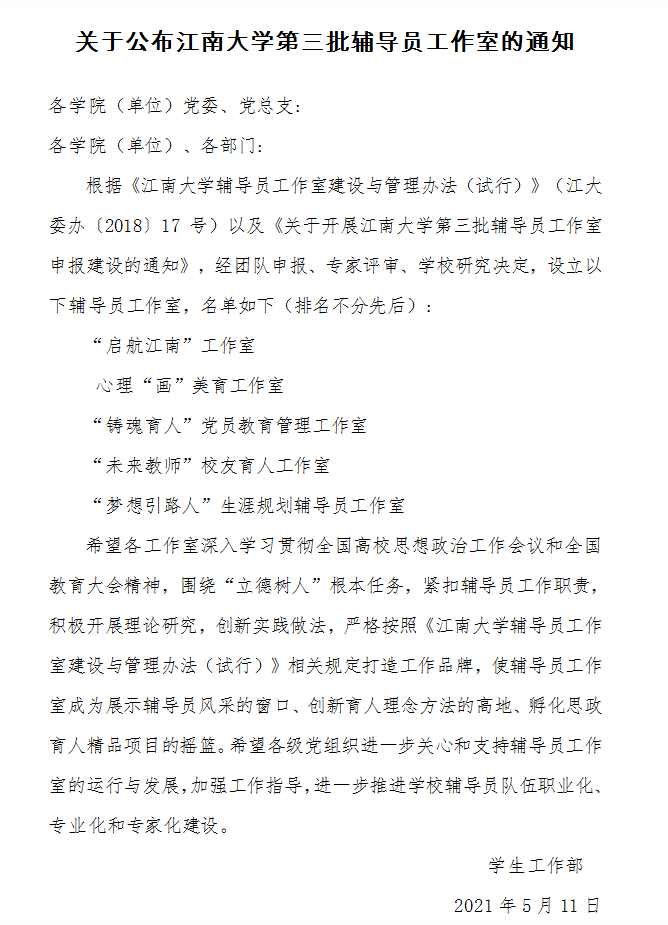 近日,根据学校《关于开展色情导航 第三批辅导员工作室申报建设的通知》,学院党委副书记陈艳君主持申报的“启航江南”辅导员工作室获批色情导航 第三批辅导员工作室立项建设。