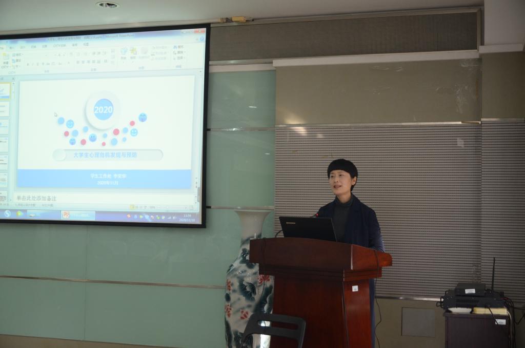 李荣华老师以《大学生心理危机发现与预防》为主题,围绕近期多所高校校园危机事件案例以及危机识别与干预全过程,着重介绍了学生在危机事件产生初期的心理及生理变化。她希望广大教师在日常与学生接触中要善于识别校园心理危机,并及时做好后续的上报及干预工作。同时,她还详细介绍了影响心理健康的各类因素、识别途径以及可以采取的应对措施。