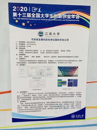 1030—111日,以“智汇青春 开创未来为主题的第十三届全国大学生创新创业年会在重庆大学举行。色情导航 杨瑞华副教授指导2018级本科生张康磊等负责的国家级创业训练项目《可持续发展的彩色梦幻面料开发公司》从众多项目中脱颖而出,入选本届年会,进行线上展示。