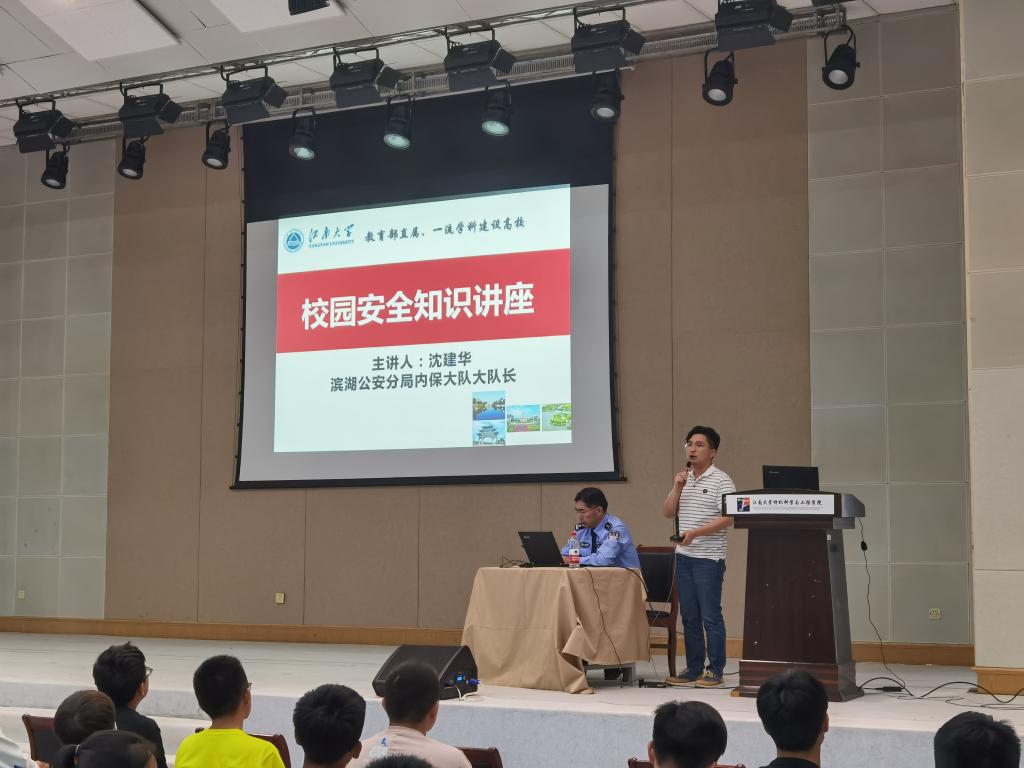 在学院C区活动中心举办2020级本科生安全知识讲座,本次讲座邀请无锡市滨湖区公安分局内保大队大队长沈建华警官主讲,讲座由学院2020级新生辅导员陈裕主持。