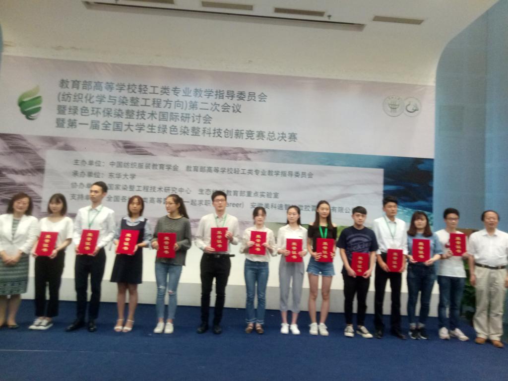 6月6日-6月8日,由中国纺织服装教育学会、教育部高等学校轻工类专业教学指导委员会主办,东华大学承办的第一届全国大学生绿色染整科技创新竞赛总决赛在东华大学图书馆举行。纺织服装学院轻化系王树根教授指导的朱逸行团队和李敏老师指导的胡安然团队分获一等奖、二等奖。