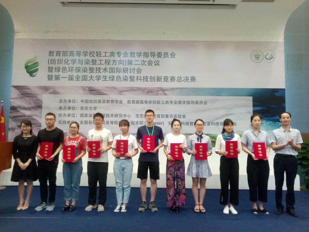 等29所高校的152件作品。专家评委在充分考虑作品的创新性、环保性和应用性基础上,评审出33项作品进入决赛环节。纺服学院15级轻化工程朱逸行团队的《天然植物染料染制品的鉴定方法研究》从众多的天然染料相关参赛作品中脱颖而出,喜获一等奖;17级纺织化学与染整工程硕士胡安然团队的作品《纳米乳胶颜料的制备及其在Lyocell 纤维原液着色中的应用》喜获二等奖。