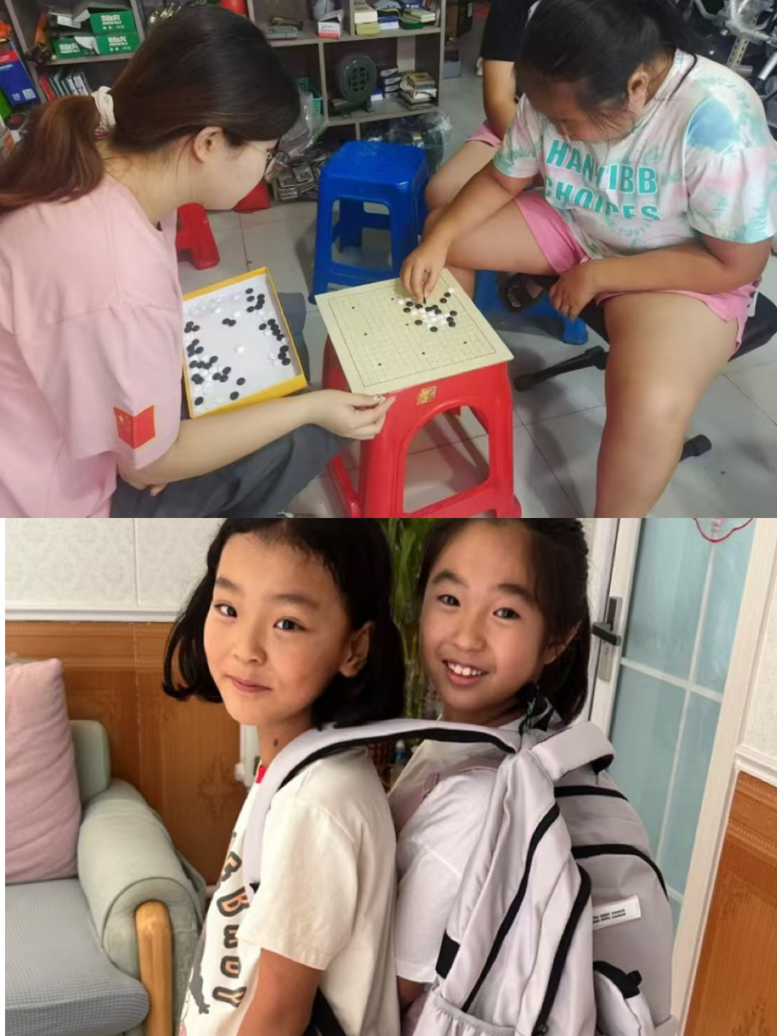 实践成员王生域、王艺璇、李昱铮、邵钰涵、朱一迪等实践成员主动联系家乡当地的社区、村委会、教育中心,以基金会发放的物资为基础,通过开展一系列妙趣横生的跳棋大赛、折纸大赛,为孩子们带去别开生面的纺织小课堂,用爱点亮被遗忘的角落。