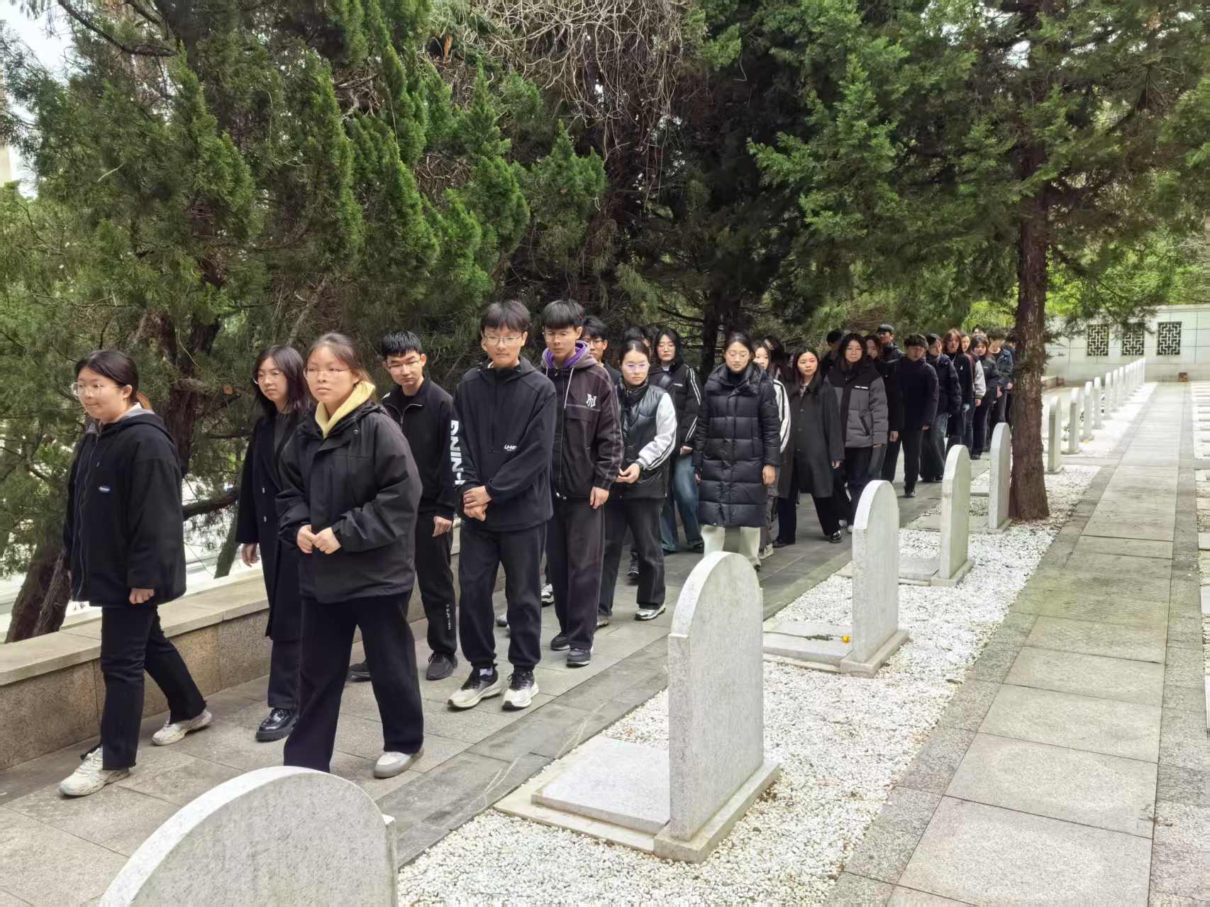 在庄严肃穆的烈士纪念碑前,全体师生列队肃立、默哀致敬,学生代表上前敬献花圈与白菊,传递深切追思。师生缓步绕行纪念碑,瞻仰烈士墓,重温革命先辈的英勇事迹。随后,在陵园陈列馆中,通过珍贵的历史资料和生动的红色故事,同学们深入了解了锡南地区革命先烈的奋斗历程,深刻感悟到革命精神的伟大力量。