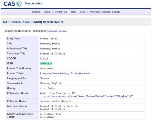 美国化学文摘(Chemical Abstract,CA)是世界最大、最全面的化学和科学信息文摘库,由美国化学文摘服务社(Chemical Abstracts Service,CAS)编辑出版,是涉及学科领域最广、收集文献类型最全、提供检索途径最多、部卷也最为庞大的一个著名的世界性检索工具。经美国化学文摘来源索引(CAS Source Index,CASSI)平台确认,《服装学报》正式被美国化学文摘收录。