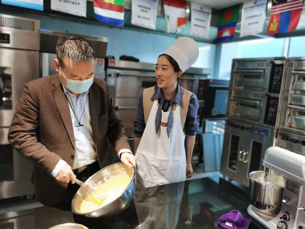 3月11日下午,大家兴高采烈赶到烘焙制作中心,积极参加烘焙活动。活动开始后,烘焙老师详细为大家讲解烘焙食材如何搭配,并演示了制作巧克力和草莓蛋糕卷的步骤。听完讲解,大家一展身手,在烘焙老师的指导下,处理了蛋黄、奶油制作的配比、戚风蛋糕的工艺,一个步骤、一个工序地悉心制作,开心之情溢于言表。打开烤箱的那一刻,香味四溢,现场弥漫了快乐和幸福的味道,大家瞬间由“小白”变身“西点大师”。
