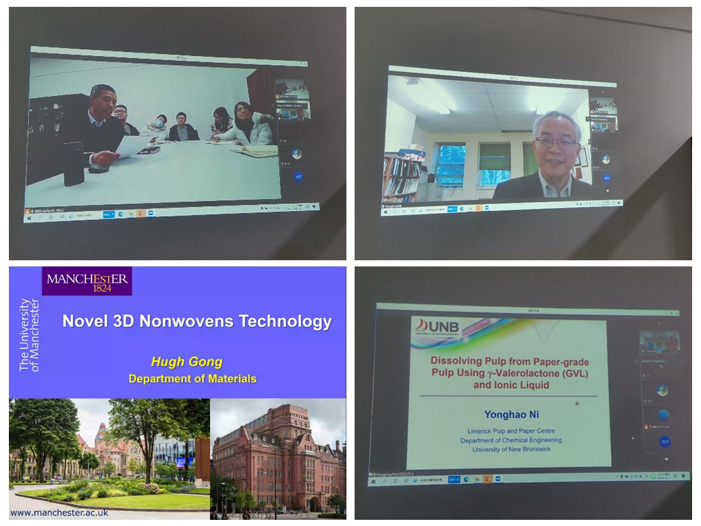 肖惠宁教授以纤维素材料与非织造材料为对象,从其憎水、水蒸汽阻隔、油脂阻隔和细菌(病毒)阻隔改性等四个方面介绍了其团队目前所做的一系列研究工作以及相关研究成果;倪永浩教授在报告中首先介绍了溶解浆的相关研究背景(广泛的用途和巨大的市场需求),接着通过介绍两种常规溶解浆的生产工艺引出了其团队目前围绕溶解浆所做的一些工作——如何从纸浆中生产溶解浆;拱荣华教授以为什么选择非织造加工技术为切入点,重点从自主设计组装相关设备,以及如何控制气流制造3D纺织品等方面介绍了他们团队的研究工作。拱荣华教授及其团队开发了一系列精巧的设备,并且用这些设备制造了许多3D结构的纺织品。三位教授渊博的知识和创新的意识给参与线上讲座的师生留下了深刻的印象,赢得了老师与同学们的广泛好评。