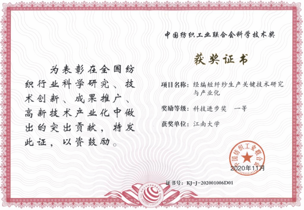 蒋高明教授团队“经编短纤紗生产关键技术研究与产业化”荣获科技进步一等奖(第一单位);高卫东教授团队“花式色纺纱多模式纺制关键技术及应用” 获科技进步一等奖 (第二单位);付少海教授团队“纳米颜料制备及原液着色湿法纺丝关键技术” 获科技进步一等奖 (第二单位);王强教授团队“功能性易护理羊毛织物的生物法制备关键技术及应用”获中国纺织工业联合会科学技术发明奖二等奖(第一单位);王潮霞教授团队“纺织品清洁化生产用夜状分散染料开发及其产业化应用”获科技进步二等奖 (第一单位);王春霞老师参与的“精油微胶囊的设计、制备及其在纺织品功能整理中的应用”获中国纺织工业联合会科学技术发明奖二等奖(第二单位);卢雨正副教授参与的“喷气涡流纺高支高混比汉麻家纺面料生产关键技术及应用”获科技进步二等奖(第二单位);袁久刚副教授参与的“无甲醛免烫整理剂的研制及高品质免烫全棉面料的开发”获科技进步奖二等奖(第二单位)。此外,我校蒋高明教授团队“针织全成形运动休闲内衣的设计与开发”获评“纺织之光”2020年度中国纺织工业联合会针织内衣创新贡献奖。张丽平副教授获“纺织之光”2020年度教师奖;关玉、王静安等五名同学荣获“纺织之光”2020年度学生奖。