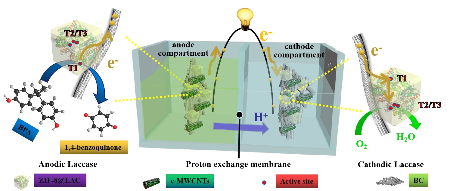 魏取福教授团队采用新型多孔有机金属框架材料作为酶分子固定化载体,得到了具有优异稳定性的固定化酶,并将其用于制备一种可同时作为酶生物燃料电池阴极和阳极的纤维素基高柔性电极,最终基于分子内电子转移的新概念(Chem. Eng. J., 379 (2020) 122316)构建单酶生物燃料电池基自供能传感器,实现了对酚类污染物的自供能检测。该项工作近日以题为“Encapsulation of Enzyme by Metal-Organic Framework for Single-Enzymatic Biofuel Cell-Based Self-Powered Biosensor”的研究论文被发表在Nano Energy杂志(Nano Energy68 (2020) 104308)