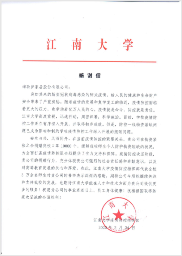 我校疫情防控指挥部致海聆梦家居股份有限公司的感谢信