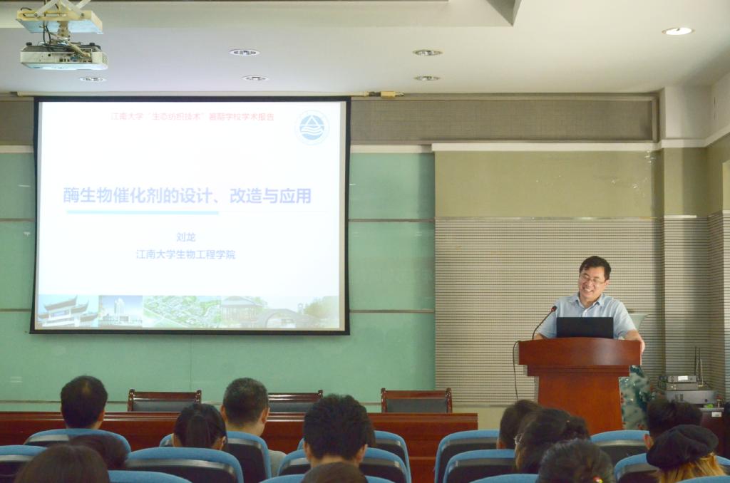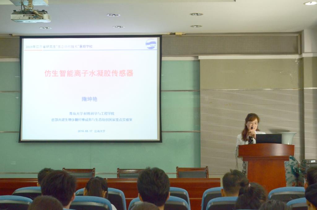 生物工程学院刘龙教授就酶制剂产业情况、研究案例以及今后研究重点三个方面展开,做了“媒生物催化剂的设计、改造与应用”的学术报告,他认为酶生物催化剂设计改造和应用酶制剂产业对可持续发展、绿色环保以及对传统化工的期待发挥了很大的作用,未来也会在不断地产业实践中对酶进行挖掘和发现,解决实际遇到的难题。随后,青岛大学材料科学与工程学院隋坤艳教授从仿生学角度介绍了一系列智能离子水凝胶传感器,他们的团队凭借地理优势,充分利用海洋生物质材料,真正做到绿色生产工艺,并介绍了仿生离子皮肤、3D打印、仿生软体机器人等方面的应用,她说任何研究都应考虑更深远的意义以及实际应用。