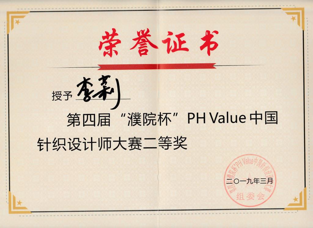 纺织服装学院师生在此次大赛中表现突出,取得了优异成绩。来自江苏省非物质文化遗产研究基地的2018级研究生李莉凭借作品《barroco》(巴洛克)荣获二等奖以及东企纱线应用奖两项大奖,并被授予“针织设计师”称号。