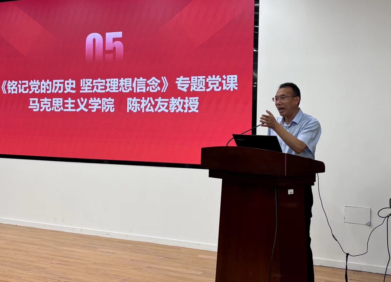 马克思主义学院陈松友教授讲授《铭记党的历史 坚定理想信念》专题党课。他围绕建党百年的“四个伟大成就”深情回顾了中国共产党百年党史的峥嵘岁月。这“四个伟大成就”一脉相承,是中国共产党百年来始终以“实现中华民族伟大复兴”为主题的辉煌成果,书写了中华民族历史上的恢宏史诗。陈教授勉励党员同志要坚定理想信念,牢记初心使命,继承和发扬党的光荣传统,以老一代革命家为榜样,勇于做走在时代前列的奋进者、开拓者、奉献者。